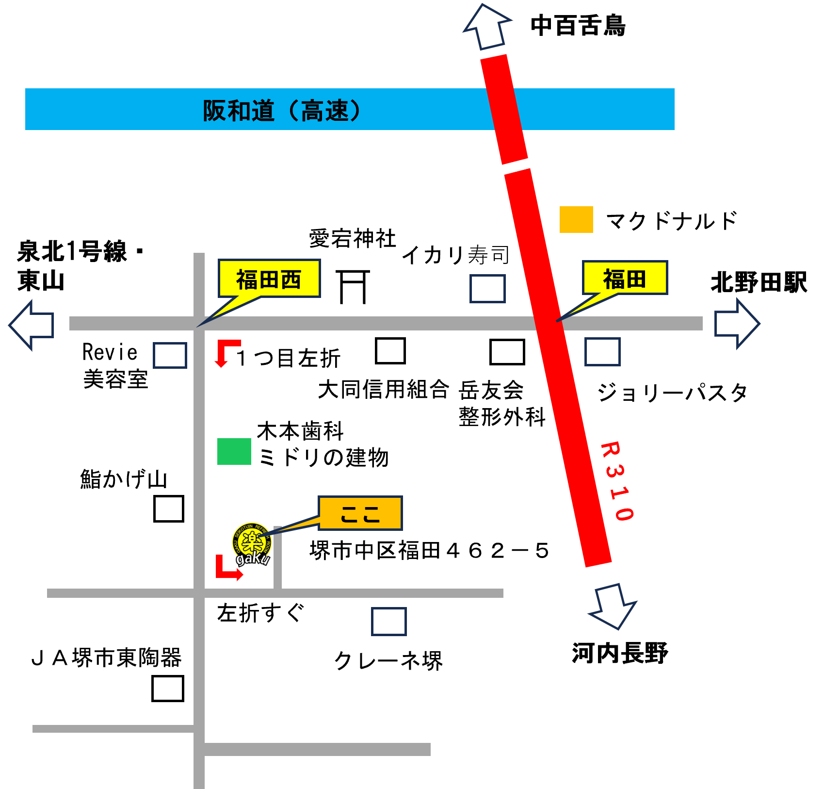 国道310号線西に曲がり次の福田西交差点を左折しその後は拡大地図のとおり。