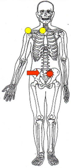mobilization)あるいは関節マニピュレーション(Joint manipulation)とも言います。欧米の理学療法やオステオパシー、カイロプラクティックなどの垣根を越えて発展した徒手医学療法であり、最近では筋エネルギーテクニックと併用することにより効果を上げています。日本では理学療法分野で、関節運動学的アプローチ(AKA)が開発され広く知られるようになった。関節モビリゼーションもカイロプラクティックも、目的とする関節の可動性を良くすることは同じですが、カイロプラクティックでは瞬間急圧をターゲット関節に加えるのに対し、関節モビリゼーションは緩やかに関節に動きをつけていくテクニックです。時間はかかるがより安全なテクニックと言えます。具体的には、右骨格図で左の腰に痛みがある場合、右矢印の関節が硬くなっていることがあり、これを運動減少(hypomobile)といい、